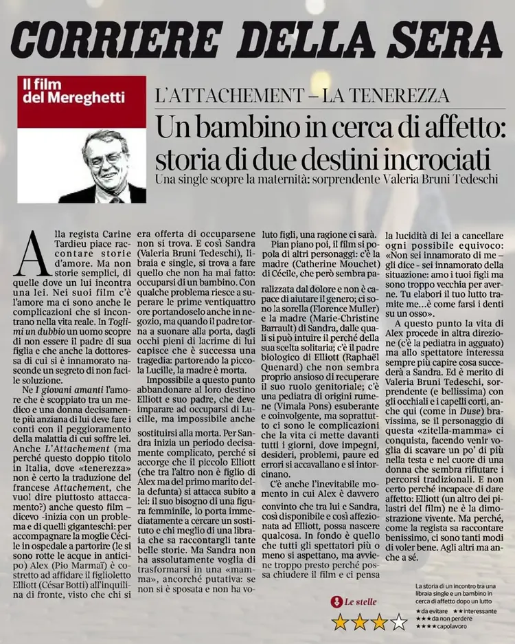 La Tenerezza, da venerdì 10 a domenica 12 OttobreL'attachement - La tenerezza | dal 2 ottobre al cinema "È merito di Valeria Bruni Tedeschi, sorprendente (e bellissima) con gli occhiali e i capelli corti, anche qui bravissima, se il personaggio di questa «zitella-mamma» ci conquista, facendo venir v