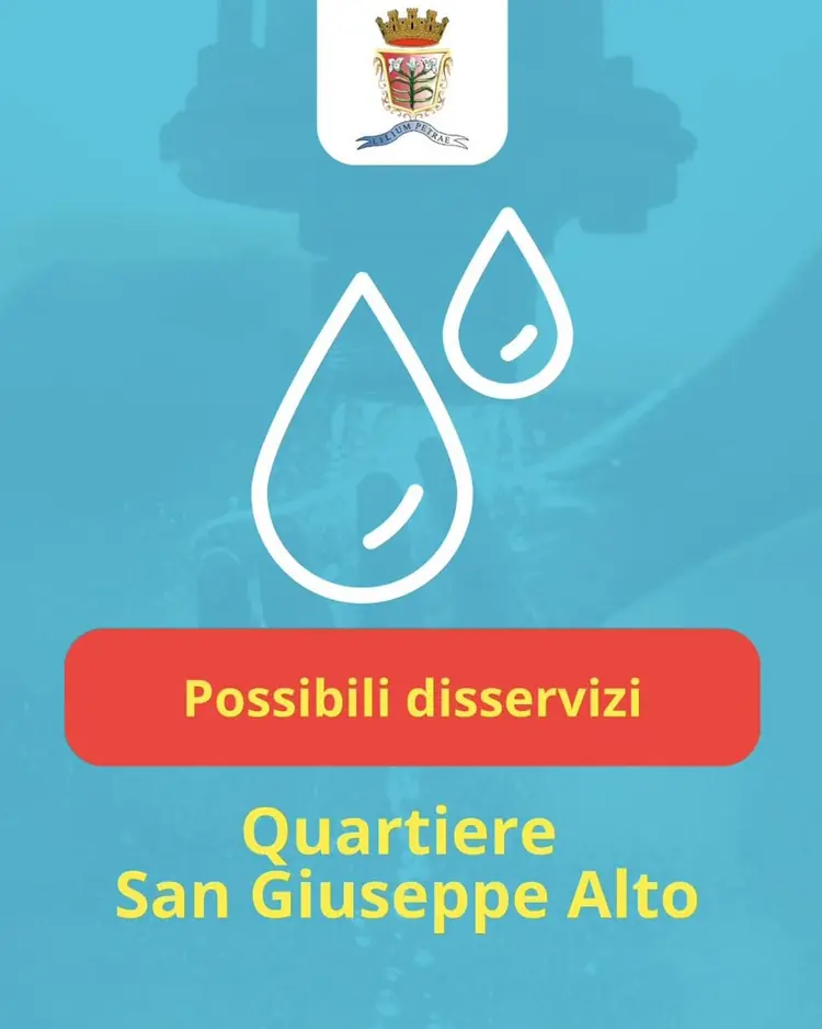 🔴Comunicazione Importante🔴 📍 Quartiere San Giuseppe Alto 🗓️ dall’8 gennaio sino a fine lavori. A causa di un intervento di manutenzione straordinaria alla condotta idrica sono previsti possibili disservizi ed è probabile la sospensione dell’erogazione dell’acqua nel quartiere San Giuseppe parte alt
