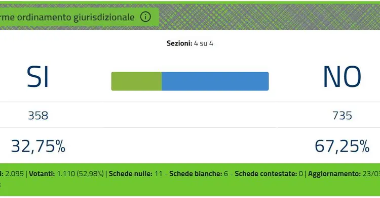 Si comunica di seguito l’esito della consultazione referendaria del 22 e 23 marzo 2026 per il Comune di Petralia Sottana. Con un’affluenza del 52,98% (1.100 votanti), ha prevalso il “No” alla riforma costituzionale con 735 voti, pari al 67,25%. Il “Sì” ha fatto registrare 358 voti, pari al 32,75%. S