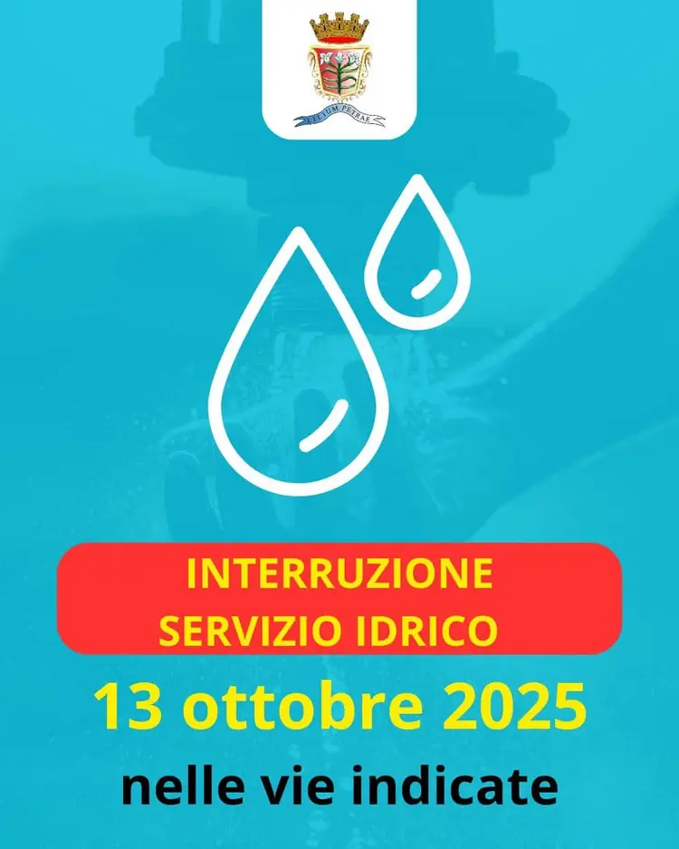 💧Lunedì 13 ottobre, dalle ore 10 e fino a conclusione lavori (previsti in giornata), verrà effettuata una chiusura dell'acqua per permettere il collegamento di parte della nuova conduttura. L'interruzione potrà interessare,oltre il quartiere Casale, la via principe di Piemonte, la via Garibaldi, la